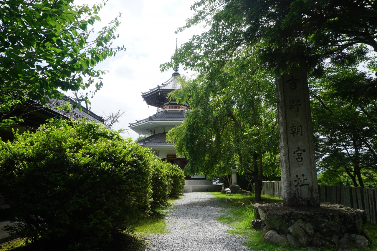 金輪王寺・吉野朝皇居跡は、蔵王堂の西側の石段を下りて行った先。いったん、吉水院に難を逃れた後醍醐天皇ですが、改めてここにあった実城寺を皇居とし、寺号を金輪王寺と改めました。後醍醐天皇は都へ帰ることはできず、ここで生涯を閉じます。