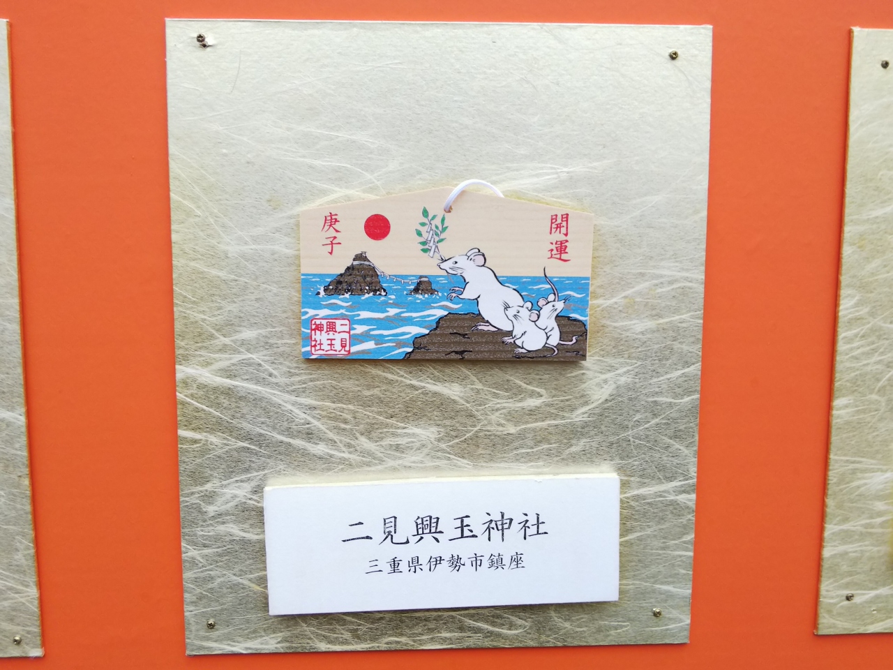 どんな絵馬があるのかというと、来年が子年なので、基本鼠が図案に採用されているが、志波彦神社・鹽竈神社なら鹽竈桜、二見興玉神社(三重県)なら夫婦石、報徳二宮神社(小田原)なら二宮尊徳先生といった地域性特色もかいまみえた。