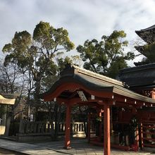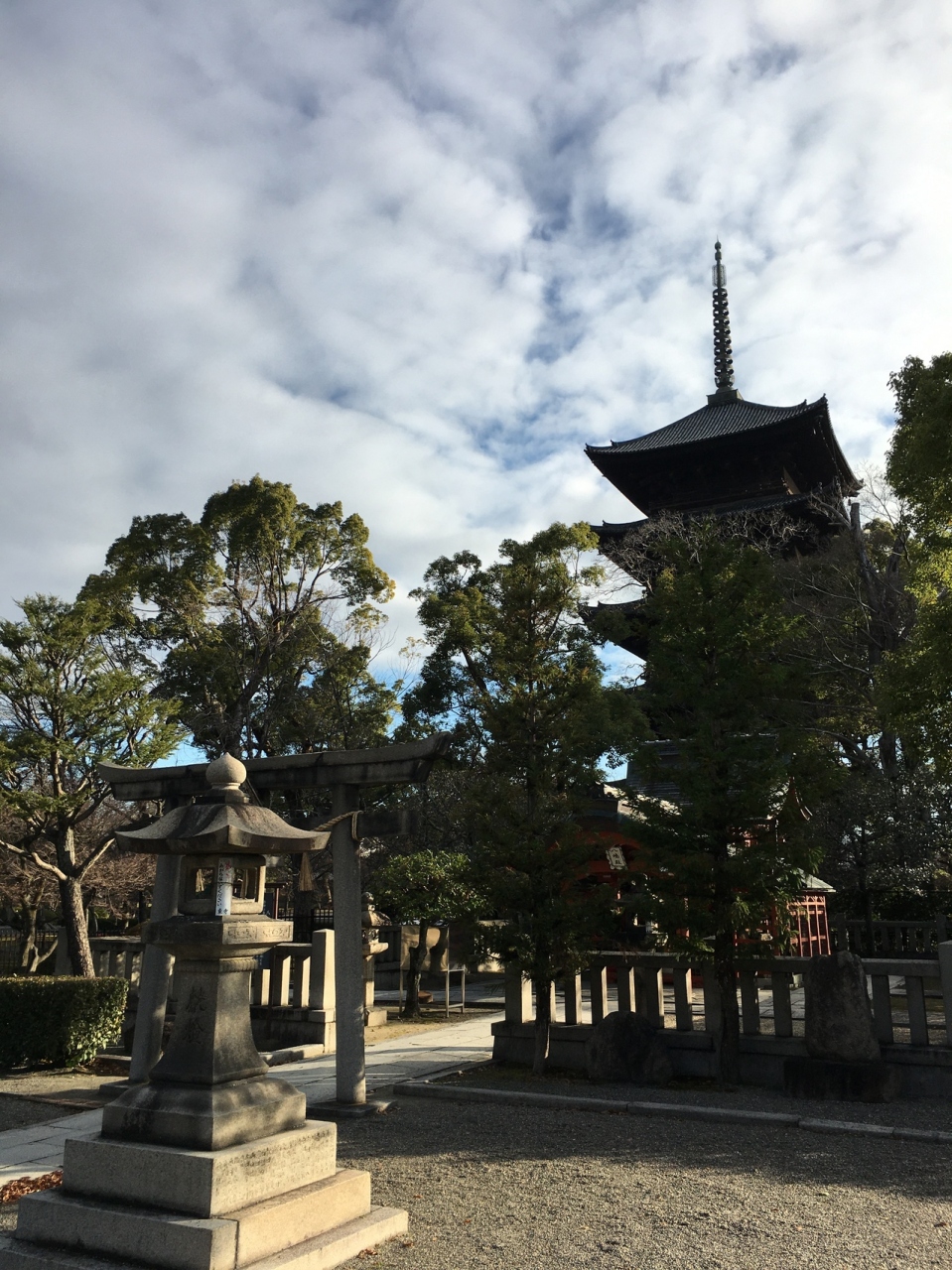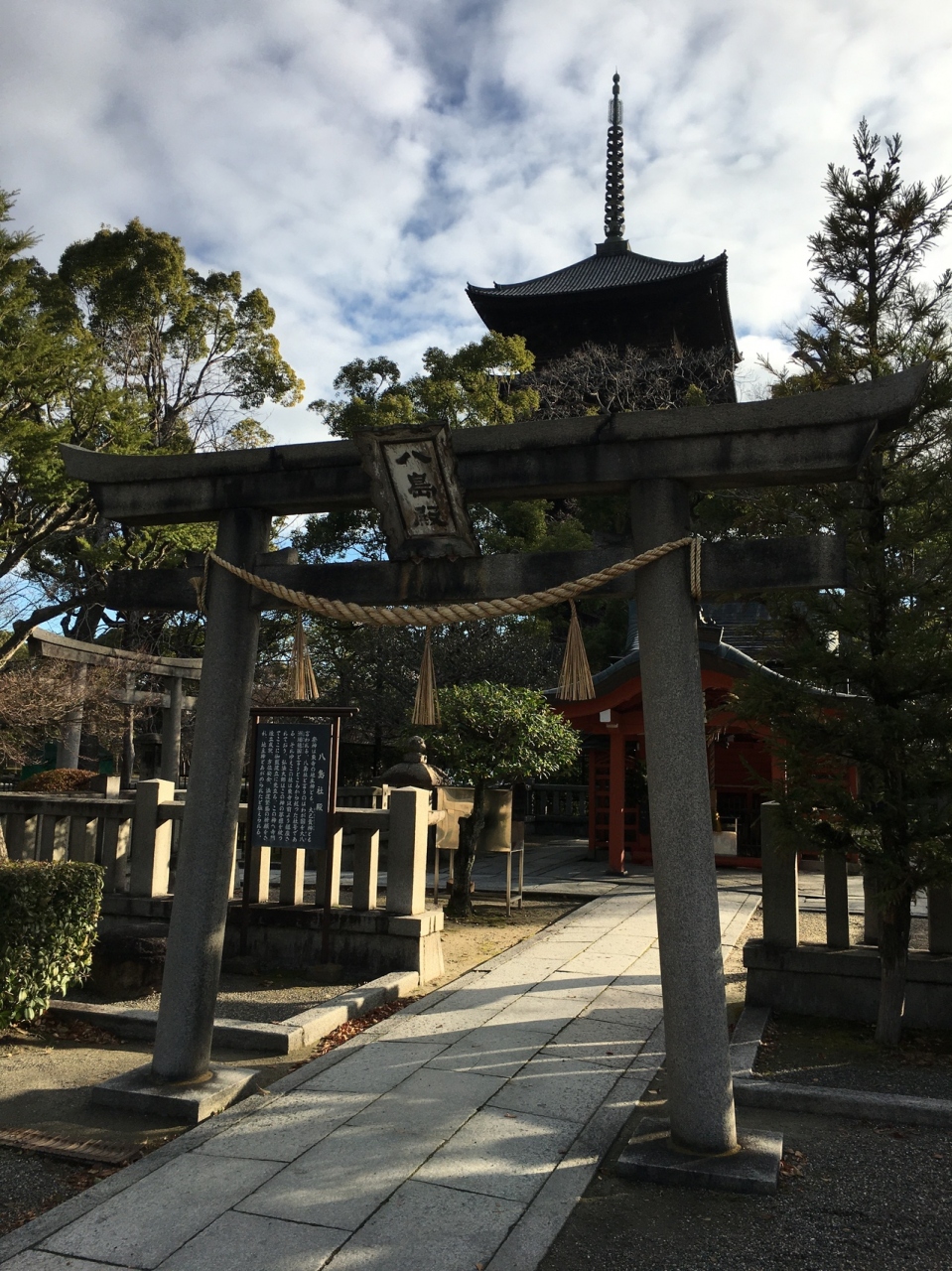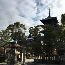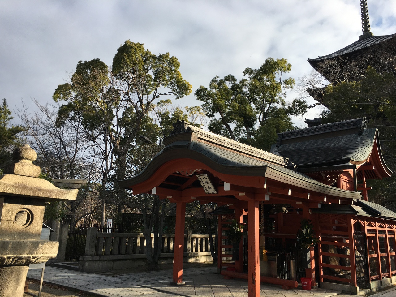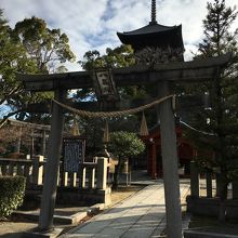 南大門を潜り、広い空間の右側にグレーの鳥居があり、しめ縄が掛かっていました。鳥居のすぐ後ろが社殿で、朱色の色が鮮やかで前面に屋根が突き出ているので雨でもお参りするのに濡れなくて良いです。少し上を見上げると五重の塔が見えました。