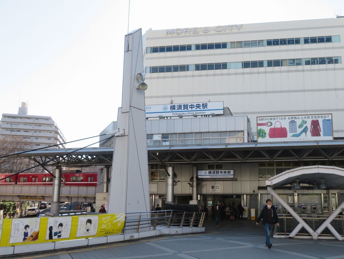 西口:駅隣接の横須賀モアーズシティがすぐ。平坂を通って上町方面出口。