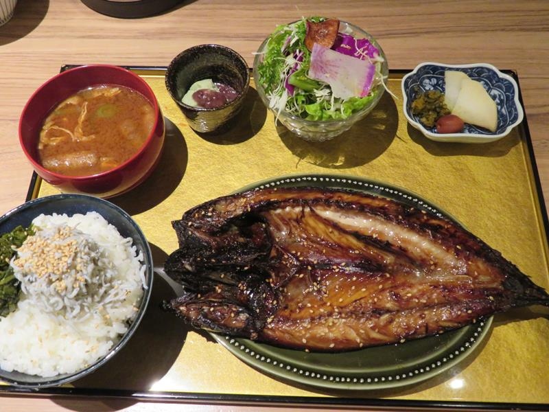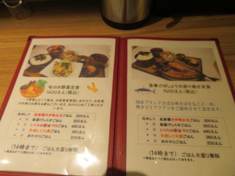 メニューを見ると「ふわとろ卵のしらす丼」が人気みたいですが、おすすめメニューに「旬のお野菜定食」。どちらも気になりましたが、お魚が食べたくて「金華さばしょうゆ漬け焼き定食」にしました。
