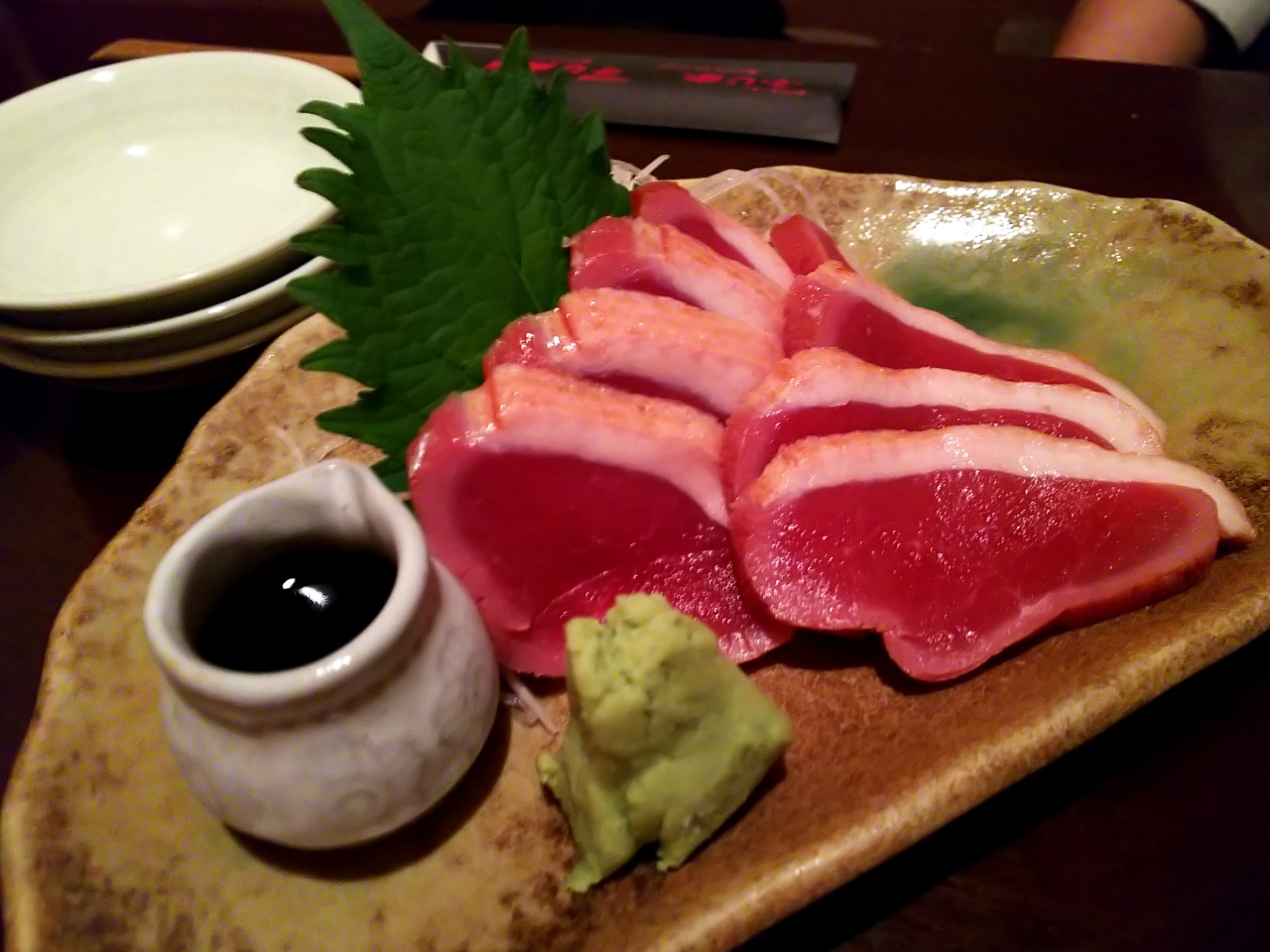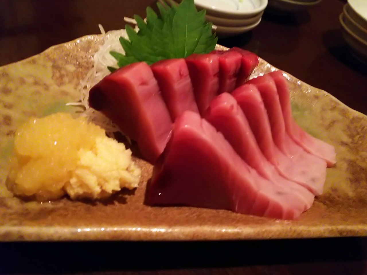 店員さんに本日のおすすめを聞くと「トロカツオの刺し身」と「舞茸の天ぷら」とのこと。つまみはその両方を頼み、ほかに鴨の刺し身・タコの唐揚げなどオーダー。乾杯はビールで、その後サワーを頼んで…お代は一人¥3000ほどでした。刺し身は新鮮で臭みはなったくなく、天ぷらはサクサク、期待していなかった分(失礼)美味しかったです。