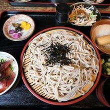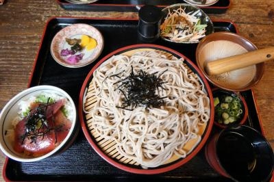 私たちが食べた平日限定 選べる定食(¥1,048-)は、選べるミニ丼に、冷・温いずれかのフルサイズのお蕎麦と、サラダまたはデザートが付きます。