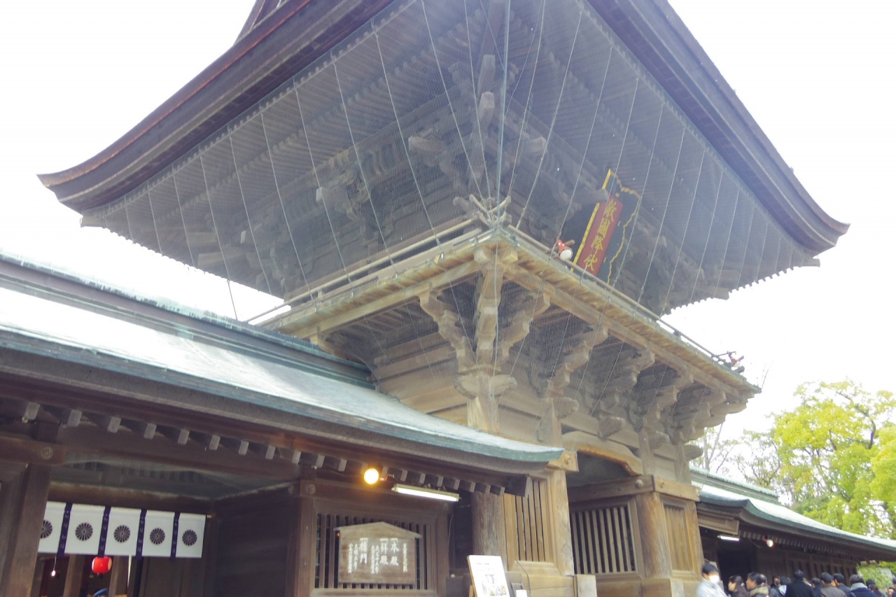 筥崎宮は楼門 がすごく立派な感じで良かったです。その楼門には「敵国降伏」と掲げられていて、いつの時代かと思ったのですが、どうやら鎌倉時代の元寇がもとみたいです。門は網で保護されていたのですが、屋根の上には鳩がいたので、網が無ければ鳩の糞に汚されるのなら仕方ないです。