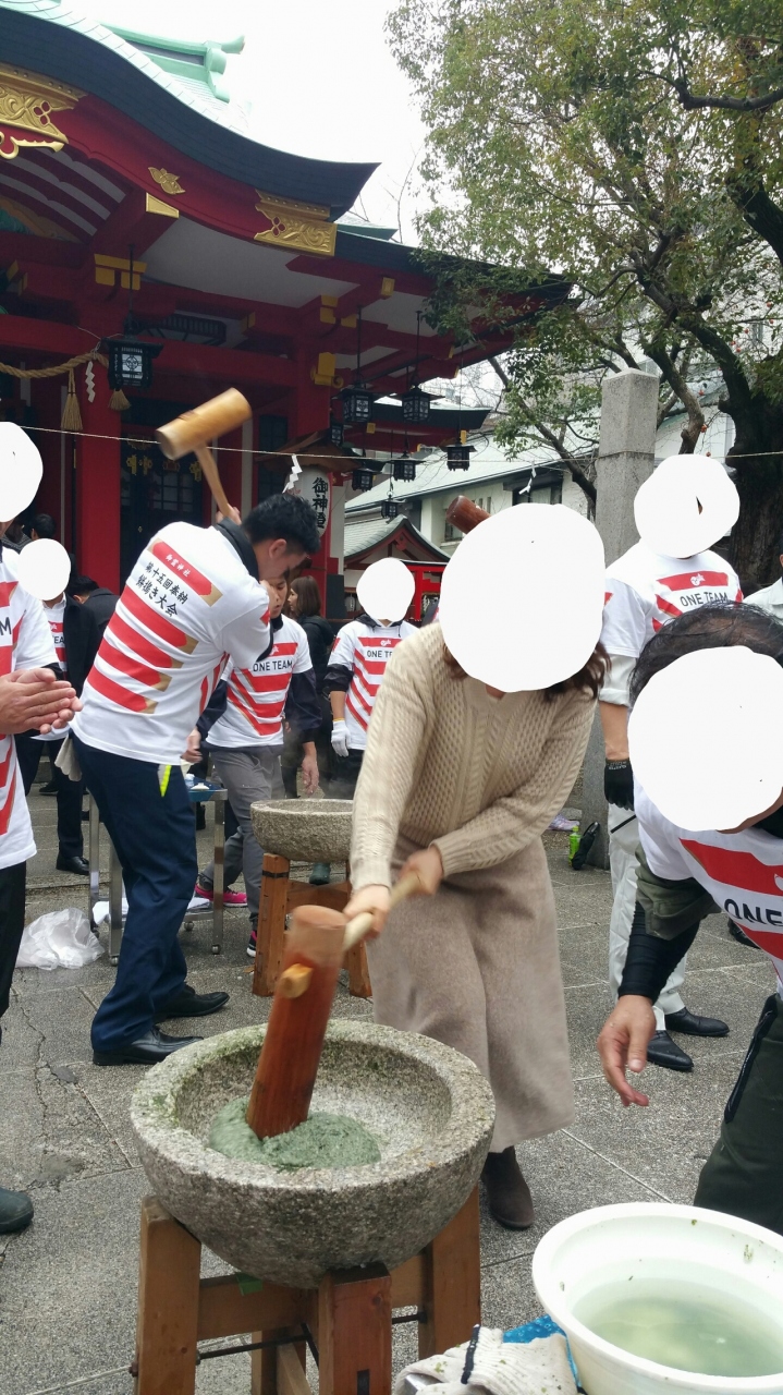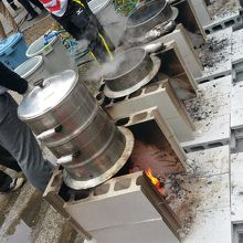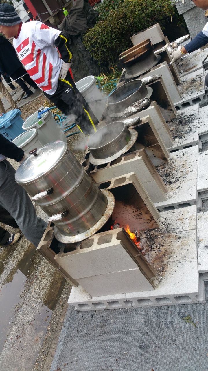 午前中から大勢の方が境内で餅米を炊き出し、臼と杵でお餅をついて準備をしています。