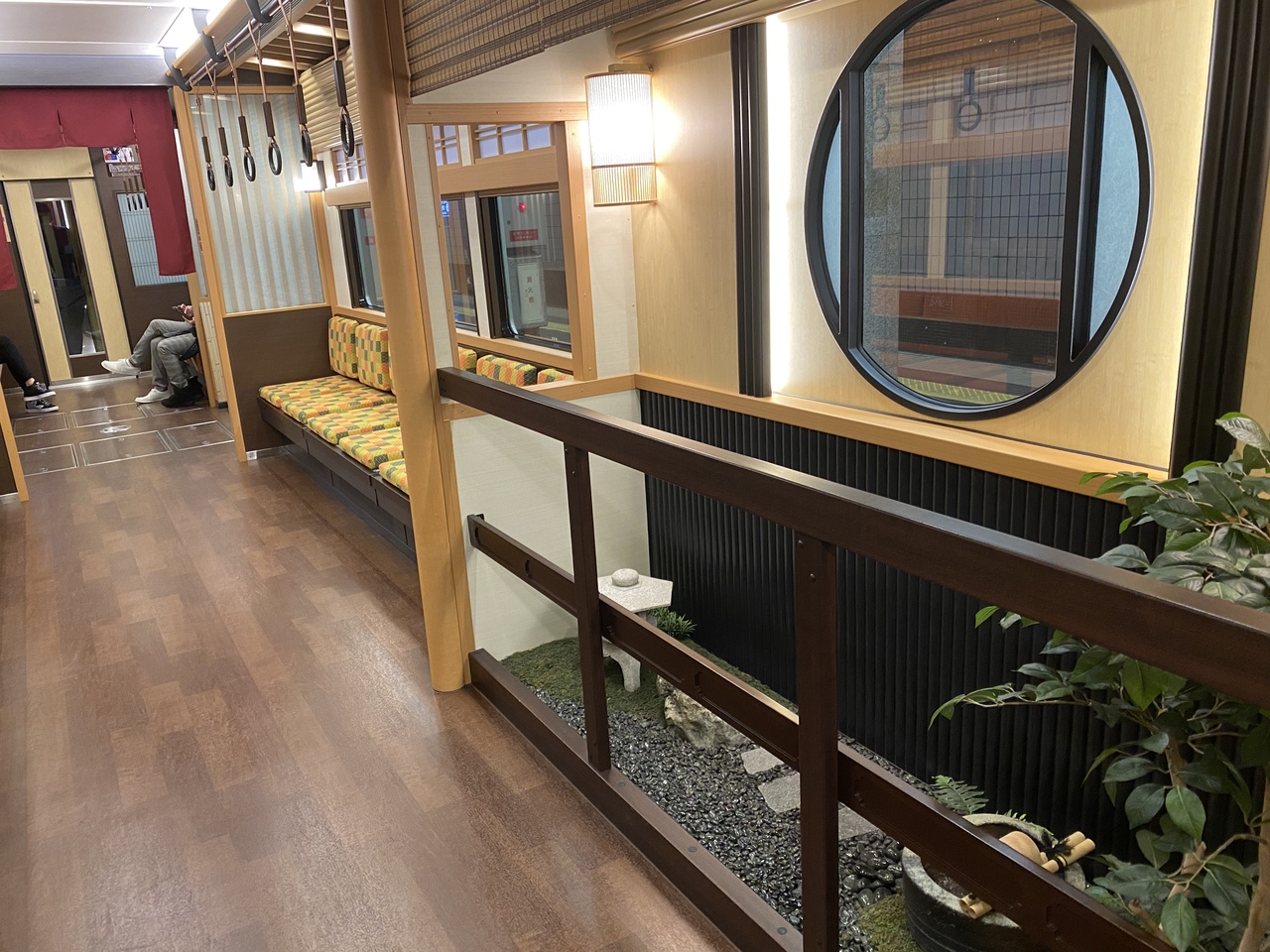 阪急京都線。休日のみ運行している電車です。内装が日本らしく装飾されています。窓向きの二人席もあります。乗車券は通常と同じなので、時間さえ合えば誰でも乗車出来ます。内装の作りは高級感はありませんが、一度乗ってみてもいいかも。