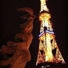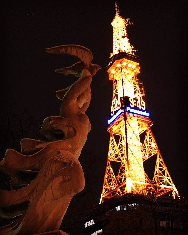すすきのから札幌駅方面へ歩いて行きました。途中、テレビ塔を通り過ぎてすぐ、交差点の角に一体の像があるのに気が付きました。これが希望の像。女性が両手で鳩か何か鳥を掲げている姿がまさに希望に満ちた感じが伝わってきました。ライトアップされたテレビ塔と一緒に撮りましたが少しは写真映えしてるかな。