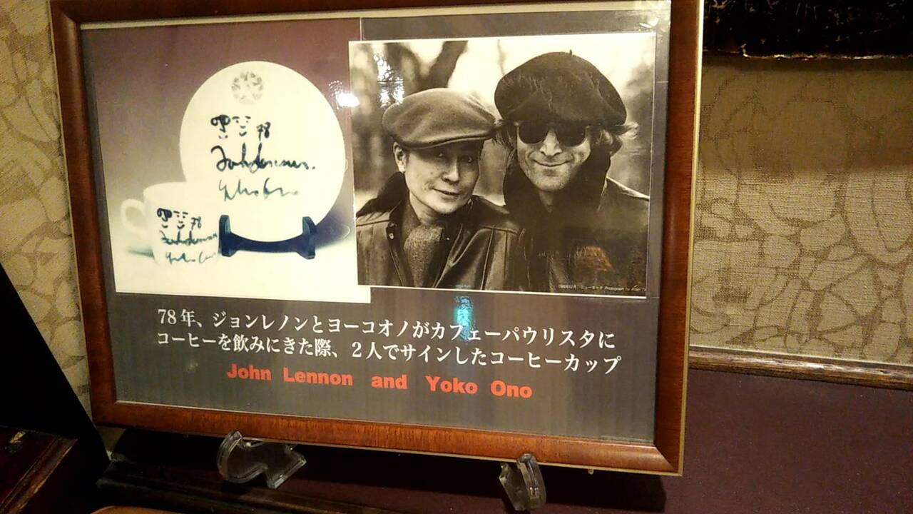 1970年代後半に日本に来てた時よく夕方にオノヨーコと訪れたそうです。その席には写真が飾ってあります。ジョンレノンはホテルニューオータニに泊まり、国技館や上野動物園に行ってたみたいです。もちろんコーヒーおいしかったです。