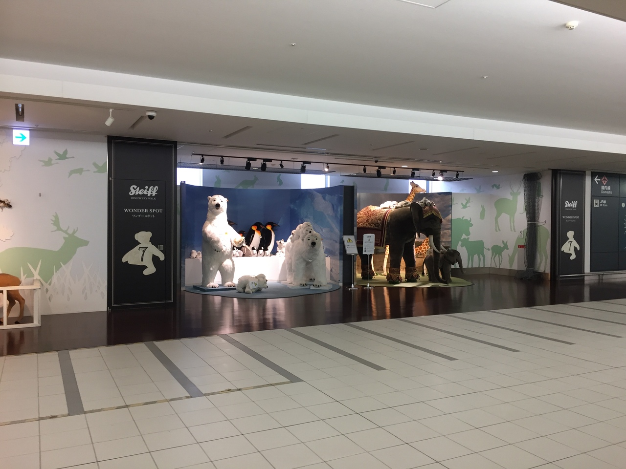 大小の動物のぬいぐるみが通路に等間隔で展示されていて、これらを買えるお店などはありませんが、とても癒される空間です。海外の方も多く通るので誰でも見て楽しめるものと思います。展示は窓側にあり、歩くエスカレーターからは遠巻きに見るしかありませんが、時間があれば記念撮影場所として良いです。