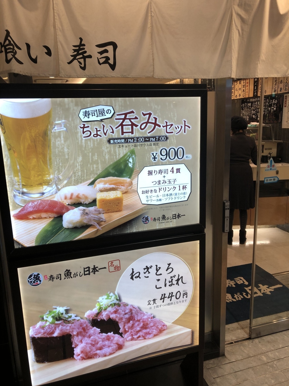 2時からはちょい呑みセットがありよりました。ドリンクと寿司がついてのセットです。まず時間がない方には助かります。その他は2種類ずつの注文になりますが165円からあるのでリーズナブルですよ。つまみメニューもあるといいのになと。