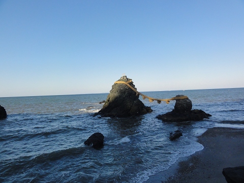 ツアーで伊勢神宮に行く前に立ち寄りました。平日、午後でショッピングプラザ前の駐車場から建物を通り抜けて行きました。伊勢を代表する観光スポットのようで、大注連縄で2つの岩が結ばれていました。縁結びのシンボルだそうです。