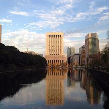 楠木正成像などを見て皇居外苑を出ようと祝田橋でお堀を渡りました。橋によって分断される西側が凱旋濠で東側が日比谷濠です。西日がキツかったですがお濠越しに対岸に見えた旧第一生命館 (DNタワー21) が美しかったです。