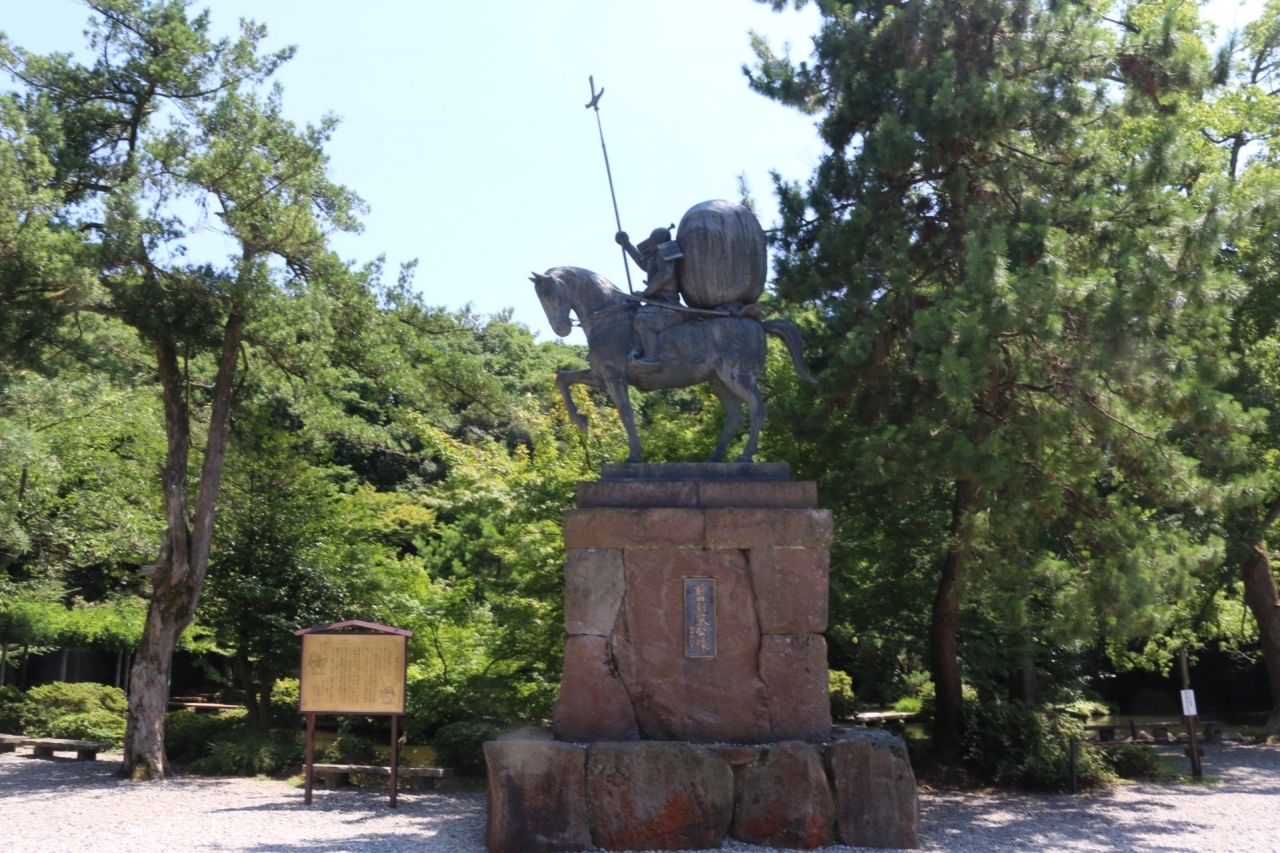 金沢城入口に建っています。建立時想定身長は180cm以上とされていたので、それはそれは雄々しく見えますが最近の研究では身長170cm位、ボデービルラーの如く厚い胸厚だったようです。徳川家康が恐れた人物だったようです。