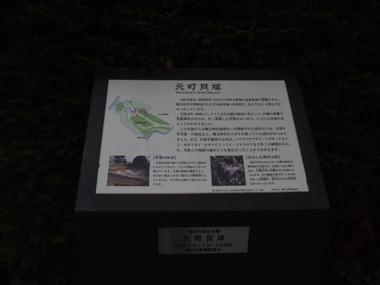 案内板に平成5年11月15日に横浜市指定史跡に指定、とありました。発見は昭和49年のようです。平成18年のアメリカ山建設の際に発掘調査が行われたようです。場所は外国人墓地の北東斜面。およそ5500万年前の貝塚が外国人墓地の横にあるってなんだかちょっと不思議。