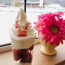 パフェは、ソフトクリームで10個程あるイチゴを挟んでいて、イチゴ好きの人には堪らないフォルムです。