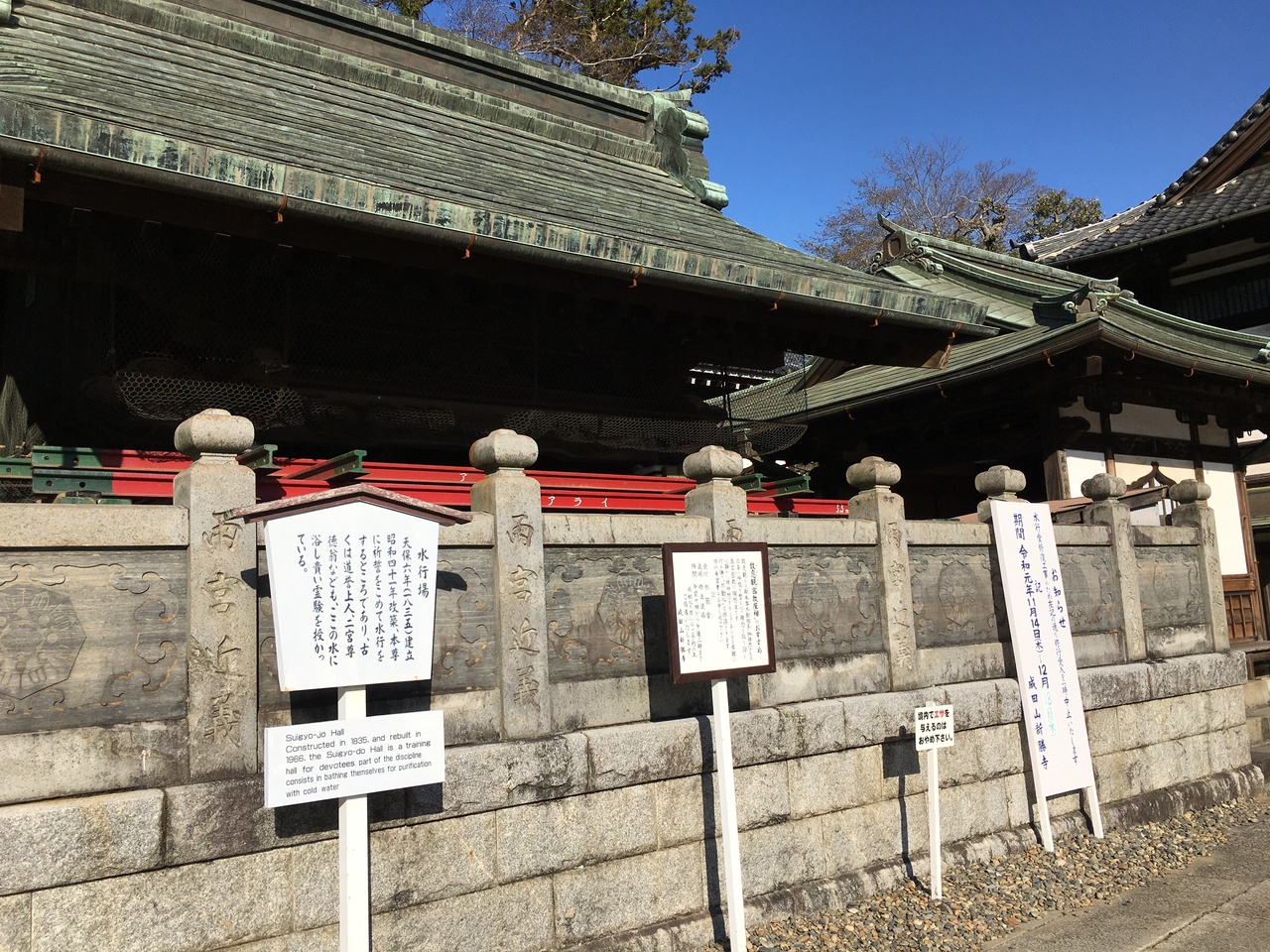 新勝寺の総門を通り抜けて右側にある古びた建物がこちらです。水を浴びて水行を行う場所で、古くはかの二宮金次郎もここで水行を行った歴史があります。もともとは1835年の建立され、1966年に改築された新勝寺の中でも比較的古い部類のものです。しかし、参拝ルートからやや外れている上、外見が地味なために気付かない参拝者が大半かと思います。
