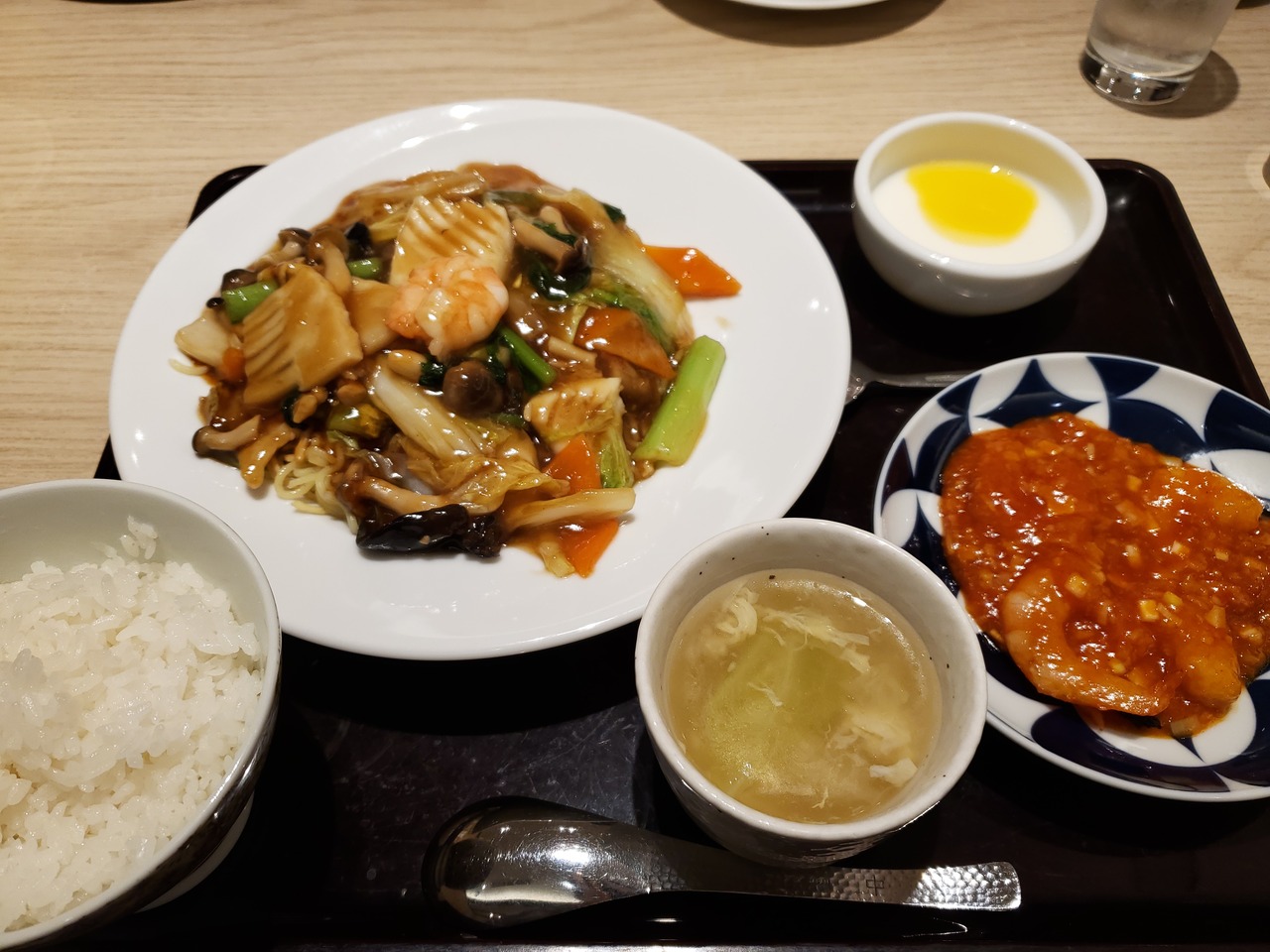 ごもくやきそばとエビチリセットです➰