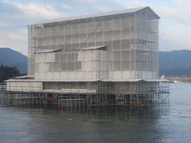 ただ、2019年12月下旬現在で、大鳥居は修復作業中ということで、巨大な工事用外壁に覆われて、全く内部が望めない状況でした。