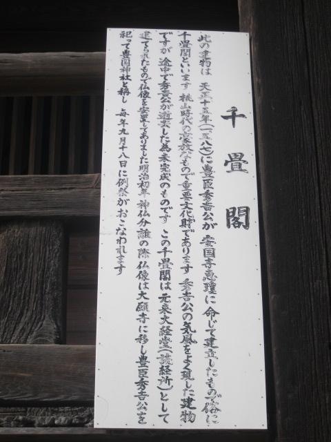 豊臣秀吉由来の神社であることはその名前からも想像がつくのですが、ここは正直、神社に参拝するという風情で足を運ぶと、ちょっと肩透かしを食らった気になるかと思います。神社名よりも寧ろ千畳閣という呼称の方が、実態に即していて、大きな建物を巡る外廻廊沿いに周囲を見物することが出来ます。