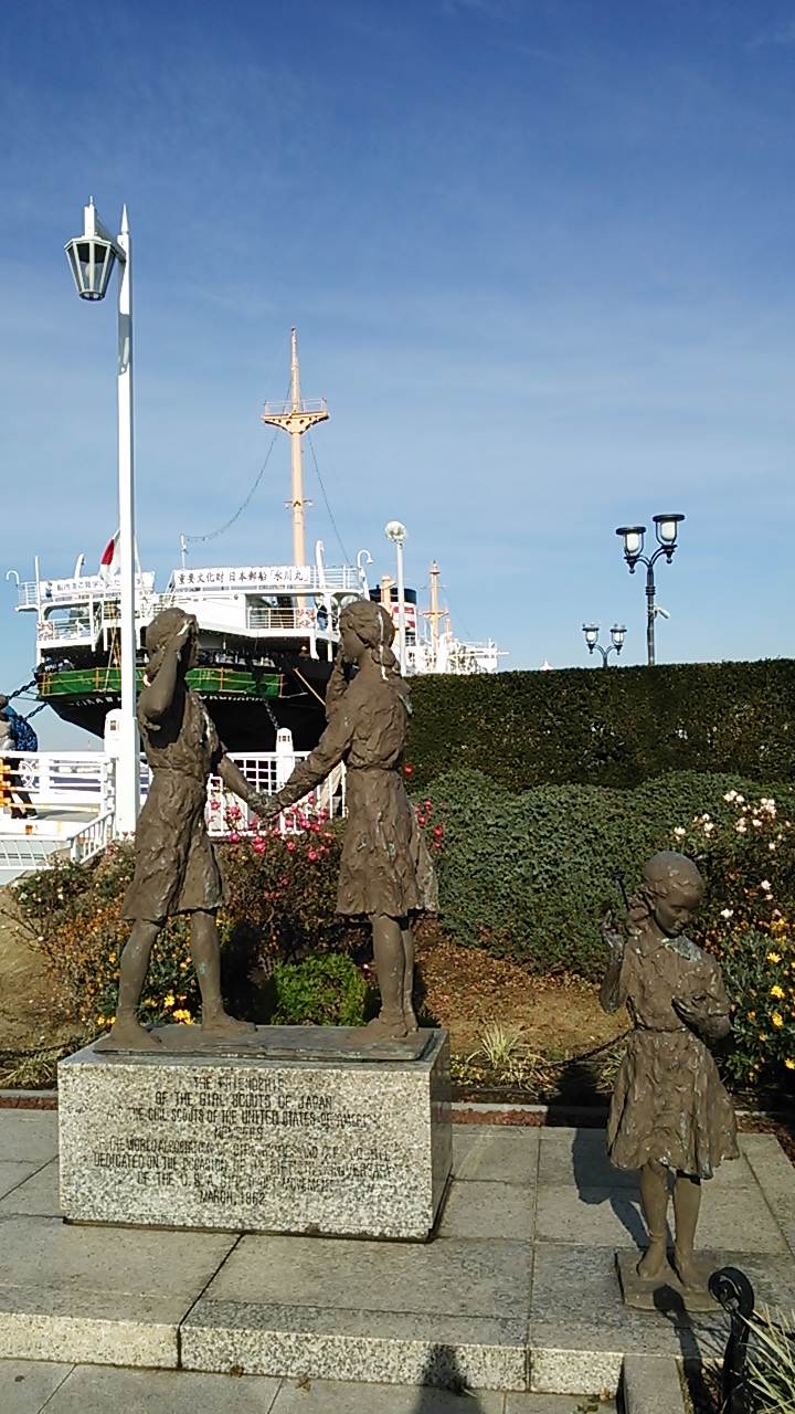 少女が握手している像で、台座に説明があるものの英文なのでわかりづらいですが、アメリカのガールスカウト50周年と、日本のガールスカウトが世界の連携に加入したのを記念して建てられたとのこと。