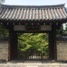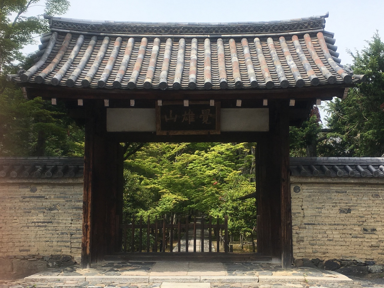 嵐電「鹿王院」駅から徒歩で5分ほどです。人通りの少ない通りに雰囲気のある土塀と山門があります。三代将軍足利義満が夢のお告げで建てたお寺だそうです。山門から続く参道が素敵でした。新緑の美しい石畳の参道が庫裡まで続きます。境内には舎利殿もありました。