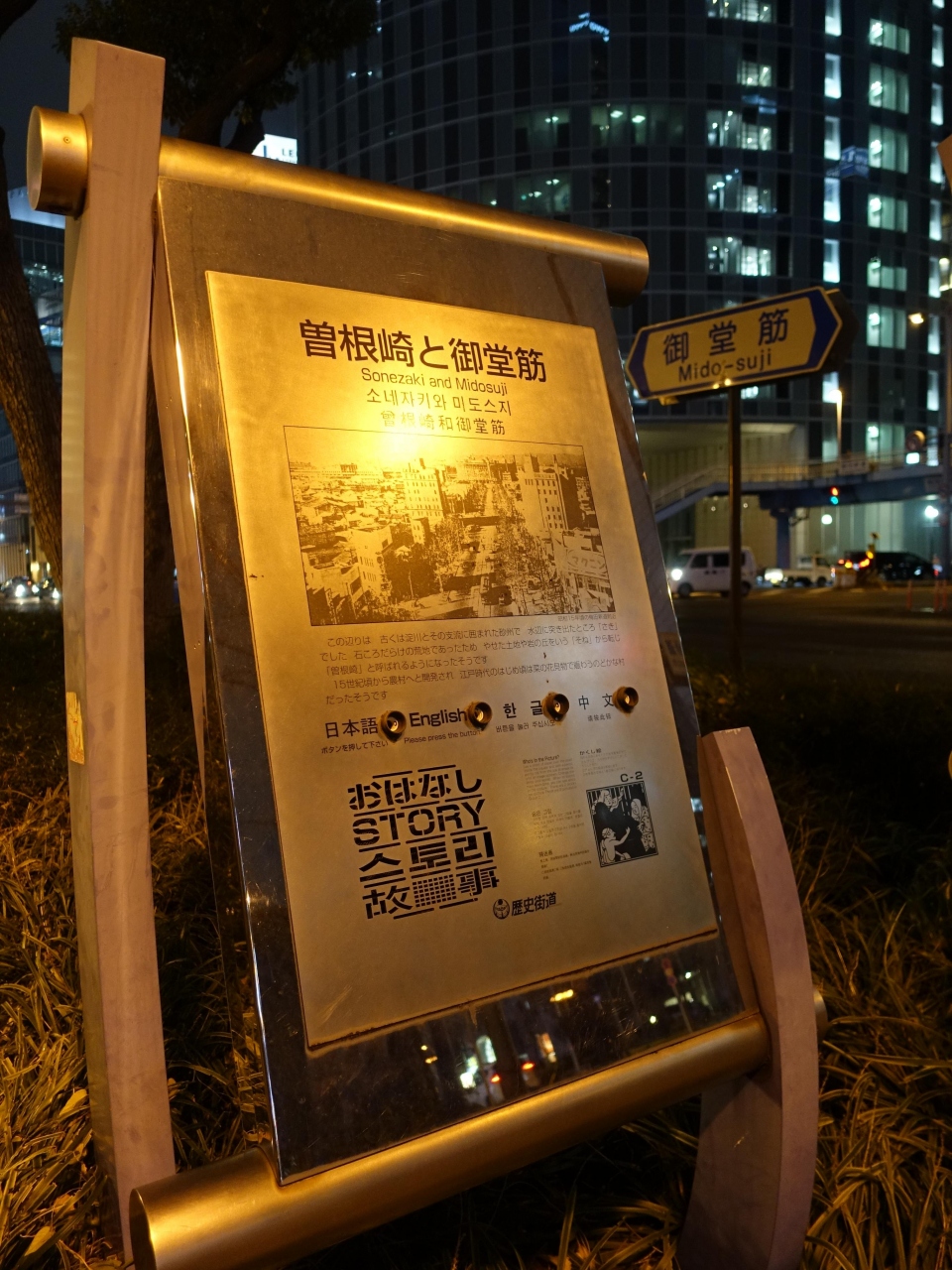 平日と休日、昼と夜でかなり印象が異なりますが、平日の夜遅く、梅田界隈で信号が変わった瞬間に一斉に車が走り出す様は、大都会・大阪を実感する光景です。これだけの道幅がありながら一方通行というのが凄いと思います。東京では見られない光景です。