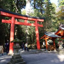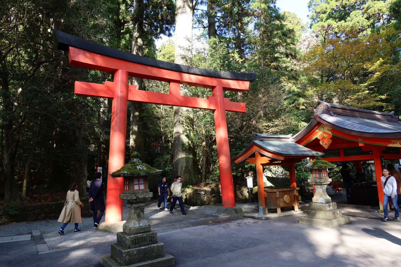 箱根の芦ノ湖湖畔 元箱根港の北東にある神社が箱根神社です。757年に万巻上人が創建したと言われる関東総鎮守の神社で、芦ノ湖に浮かぶ赤い鳥居(平和の鳥居)は箱根神社のもの。恋愛感情のパワースポットとして昨今人気のようで若い女性が多く訪れてました。