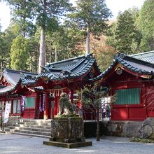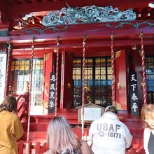太い木のある森の中に神社はあり赤と緑のコントラストが印象的でした。