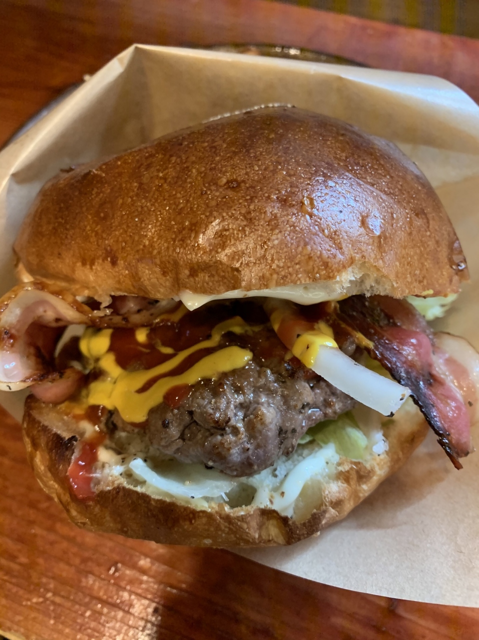 ¥1200程とそこそこの価格。出てきたバーガーはそれなりの大きさがある。バンズはカリカリに焼かれていて好みでこれが食べやすい。肉はしっかり目に焼かれているが、とてもジューシーで美味しいバーガーでした。ポテトは今ひとつなので、セットにしなくてもいいかも