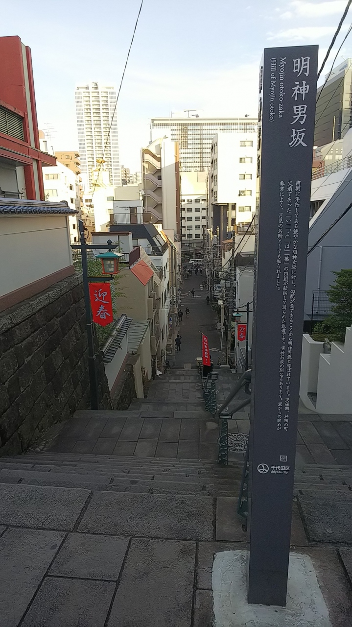 神社はどこも階段が多い。楽な女坂に対してキツイ男坂があるが近頃は逆かも。昔、火消しが組分けして登ったと書いてあります。景色が良かったと書かれておりますが、今はビルが邪魔して見えない。正面は御茶ノ水駅方面。この男坂を降りると秋葉原。中央通りへと続き秋葉原駅、銀座線末広町駅方面に行ける。
