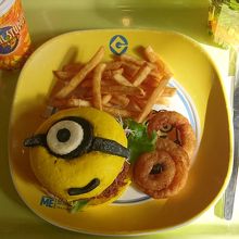 ランチにて利用いたしました。注文前にドリンクバーがあるので、一人一品オーダーするように言われます。ミニオンのバーガーをいただきました。ポテトフライ、オニオンフライが添えられており、サラダもついてきました。