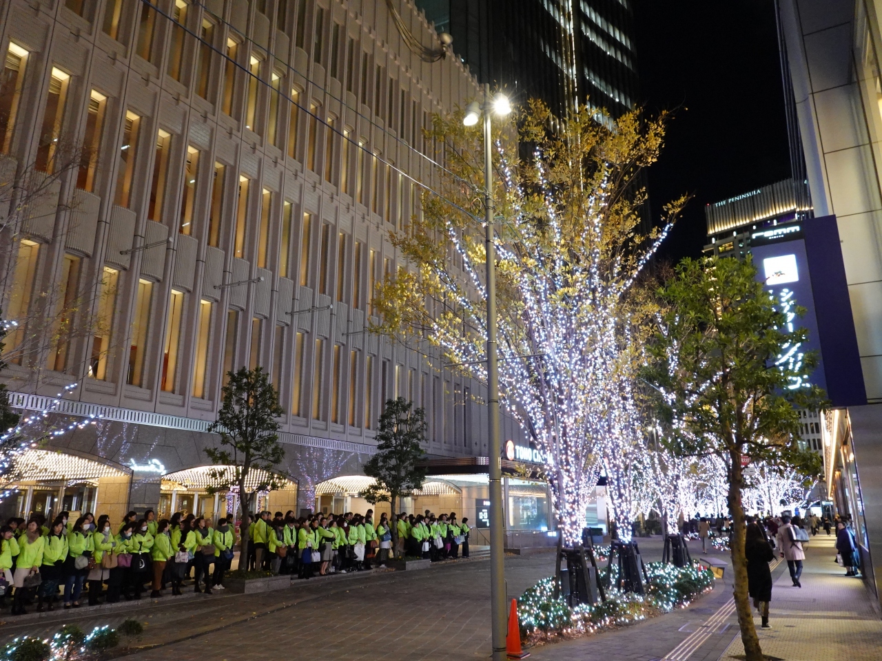 12月の東京宝塚劇場前の歩道には、イルミネーションが施され、とても美しい光景でした。私たちが訪れた日も公演が行われ、演者さんが会場から出てくるのを待っているファンの姿が見られました。寒空の中、きちんと整列されている姿は感動的です。