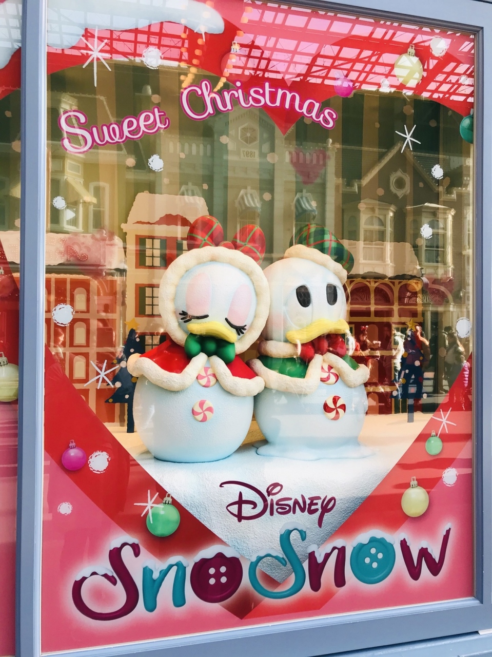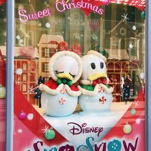 イベントグッズを扱うSHOPなので、今年新しく登場したドナルドとデイジーのスノースノー(雪だるま型のキャラクター)オブジェがウィンドウに飾られていました。