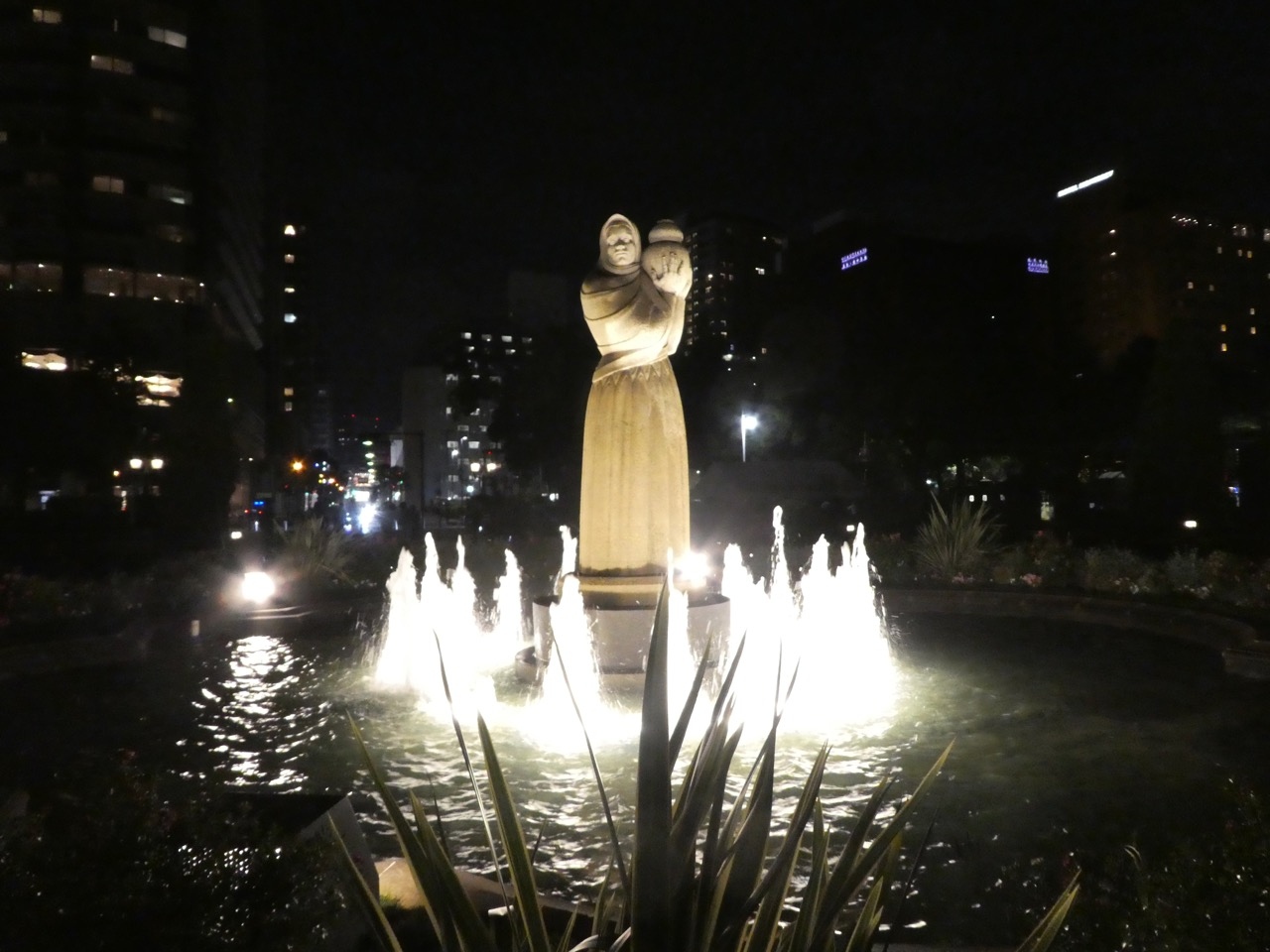 山下公園の夜の散歩。噴水の真ん中に立つ像が気になります。ライトアップで顔の陰影が強調されます。迫力のある鬼のような表情。これが女神の像だとは。やはり昼に見ないとそれらしく見えません。アメリカから贈られたものなので顔の彫りも深いように感じます。噴水は夜でもきれいなんですが、全体的には昼間に見た方がいいでしょう。