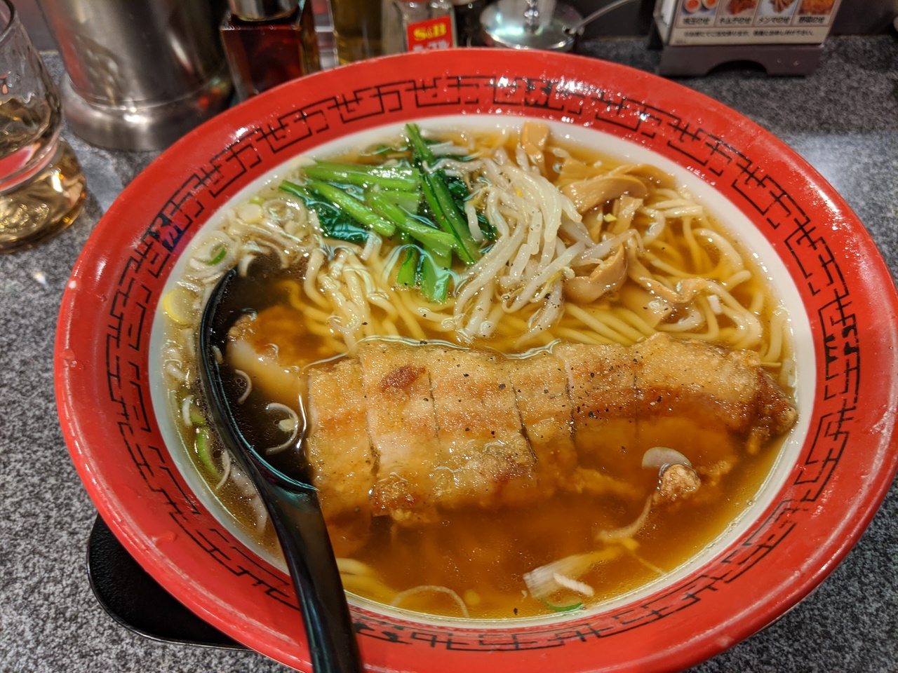 肉の万世が運営するラーメン屋です。有楽町駅前の有楽町ビル(B1階)にあるので立地はとても良い場所にある排骨麺が有名なお店です。店内はカウンター席のみ。大きな豚肉のから揚げが入った排骨麺は、あっさり醤油味のスープと太麺で美味しかったです。