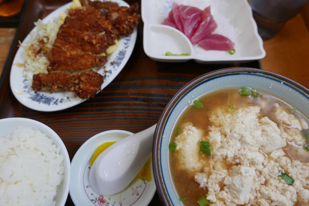 ゆし豆腐の他にもチキンカツ、お刺身ついて、650円、ご飯も多く、ボリュームがあります。コスパ高いですね。