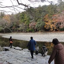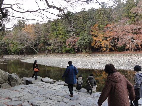 ツアーで伊勢神宮に行きました。宇治橋から見る五十鈴川は紅葉が少し残り風情がありました。手水舎でお清めしましたが、古来は五十鈴川で行ったとのことで石畳が敷かれた御手洗場も案内されました。水は思ったより綺麗で冷たかったです。