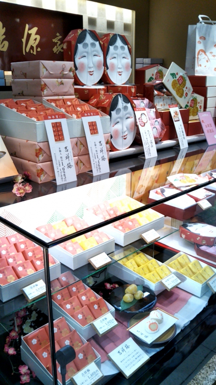 御正月の御菓子は、どれも福を招く、縁起の良い御菓子ばかりが販売されています。「源 吉兆庵」の店頭にも、縁起の良いお多福や干支の絵馬の入った招福ボックスなどが並んでいます。