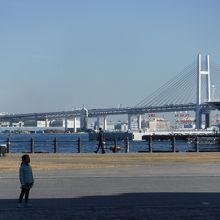 ちょうど赤レンガ倉庫のあたりからで、横浜港に浮かぶベイブリッジの白い姿が、
