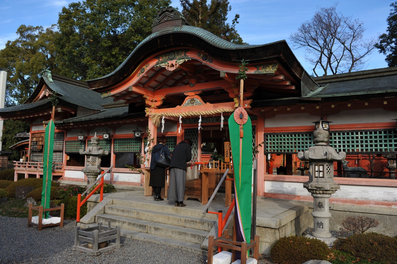 初詣で参拝した。阪急の西院駅から少し歩いた住宅街にあり、あまり広くないが、裏側に駐車場もある。奈良の春日大社を勧請した神社で、大社同様、横に長い朱塗りの社殿が特徴だ。この神社に参拝したことで内親王の疱瘡が治ったという言い伝えがあり、疱瘡を身代わりに引き受けたとされる石が神前に。触れるとご利益があるという。何となくだが、女性の姿が多いような気もした。藤の花をあしらった御朱印帳を購入した。