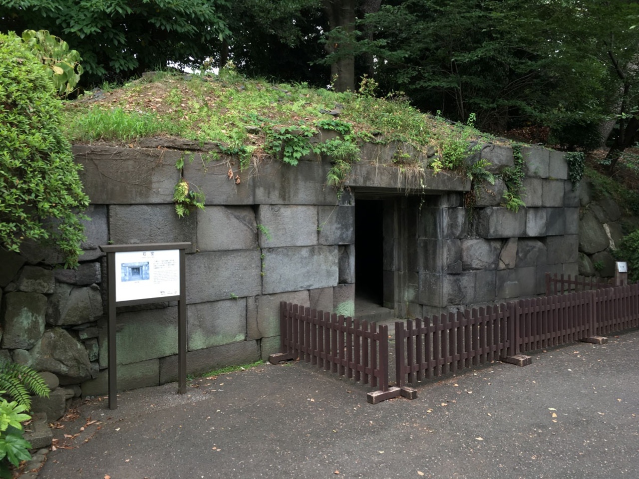 江戸城本丸の西側、富士見多聞の北側にあるのが江戸城石室。名前だけ見ると古墳かとも思いますが、実際に見ても古墳と言ってもいいほどの石造りの建造物です。ただ石垣が切り込み接ぎという積み方であることから、江戸以降のものであるとわかります。この石室は大奥のそばに当たる場所にあり、火災の際に重要な品を避難させる場所であったと考えられるということです。