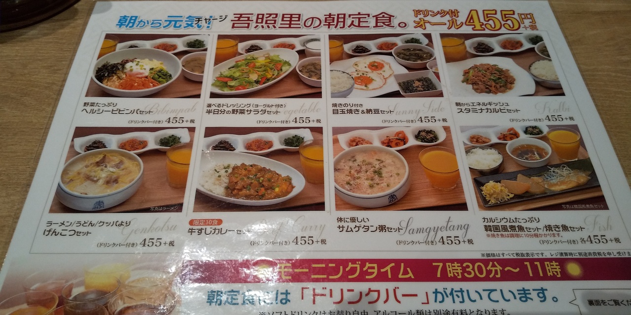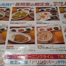 モーニングのお得な定食があります。ワンコイン 500円の朝定食は、8種類から選べます。また、ジュース類やお茶、コーヒーなどのソフトドリンクバーも付いていてコスパ最強です。