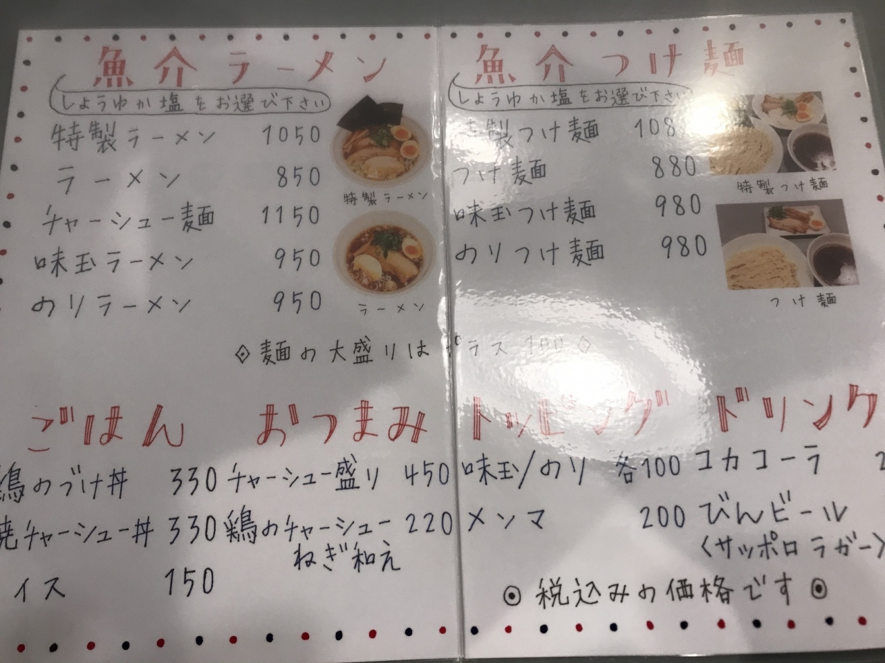 魚介ラーメンと魚介つけ麺があり、醤油か塩を選びます。つけ麺の醤油880円を注文。麺が細めなので熱盛りには向いてないとのこと。ワサビが付いており、お好みに合わせてとのことですが、正直不要です。あっさりしたつけ麺で、もう少しパンチが欲しいかな?カウンター席のみ10 席ほど。駐車場はありません。