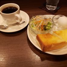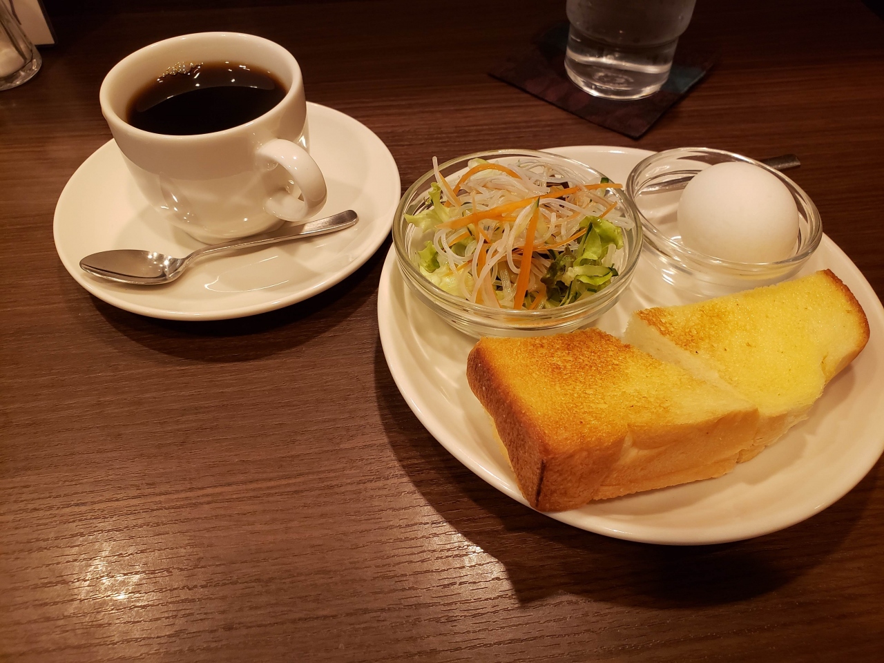 いくつかのパターンがあるが、Aセットはトースト、ゆで卵、ミニサラダ、ワンドリンクで500円。無料wifiが使え、客もまばらなので大変くつろげた。