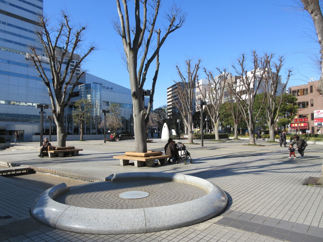 大宮駅西口にあるソニックシティの広場のように見える公園です。タイル敷きの公園で遊具はなく、周辺を訪れる人や勤めている人向けの明るい広場です。円形の中心に石のオブジェがありベンチがありました。時計台の下に鐘があり、名の由来を記した石碑と母と娘の像がありました。平日昼前に訪れたので鐘の音を聞くことはできませんでした。日当たりの良い明るい広場でした。