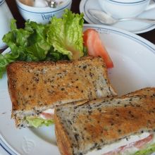 内容は日替わりらしく、今回はトーストされたセサミブレッドでコッテージチーズ、トマト、レタスを挟んでいた。分厚くスライスされた、まったりとした味わいのチーズにより、肉類は使っていないにも拘わらず、ボリューム感のあるサンドウィッチになっている。