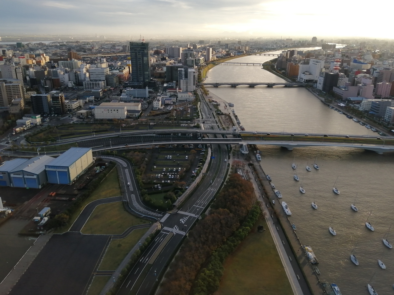 空港から新潟駅に向かうときに通ったときにはその姿はよくわかりませんでしたが、朱鷺メッセのばかうけ展望室から全景を見ることができました。
