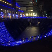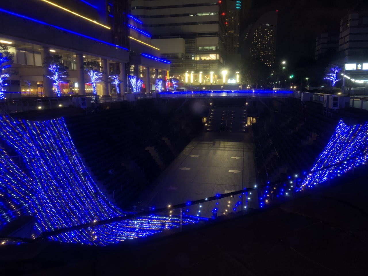 ここでは、プロジェクションマッピングをやったりしていましたが、冬には滝のように青いライトがたらされて、幻想的でとてもキレイです。クリスマスがおわってもイルミネーションは続いていました。
