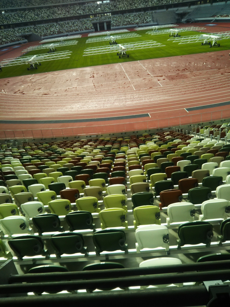 新しく出来た新国立競技場です。お仕事ではいることができました。座席は緻密な計算により、空席でも遠くから見るとひとがいるように見えました。きれいなピッチで、走りやすそうなグランドです。早く東京オリンピックが見たいですね