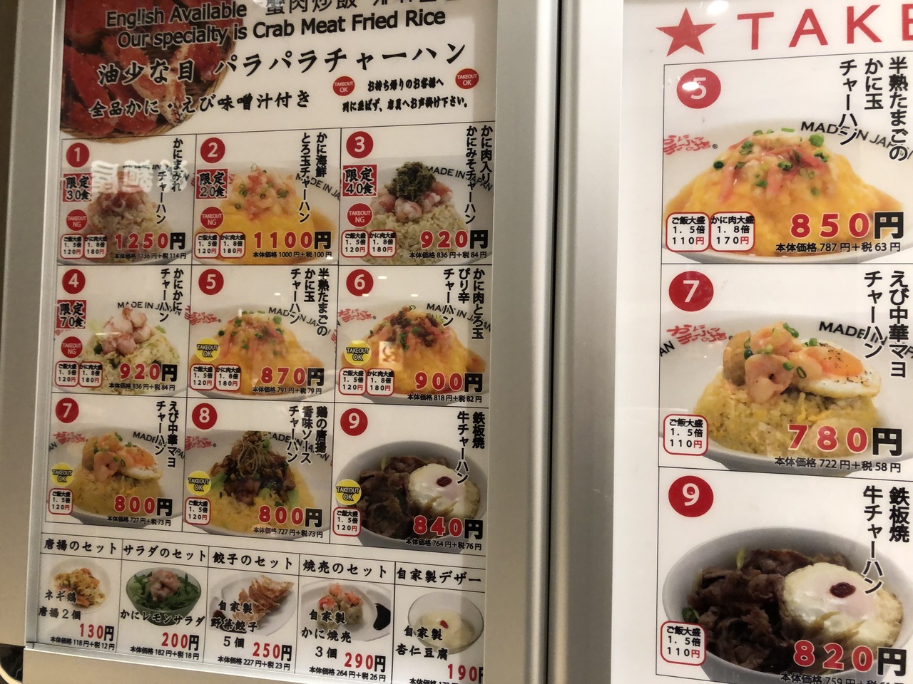 横浜駅ジョイナスの中にあります。店内満席で混み合っていました。テイクアウトもできます。専門店らしくカニチャーハンのバリエーションが豊富。餃子やシュウマイなど他の一品メニューもあります。いちばんスタンダードっぽい‘‘かにかにチャーハン’’にしてみました。かにのほぐし身がチャーハンにのっていました。
